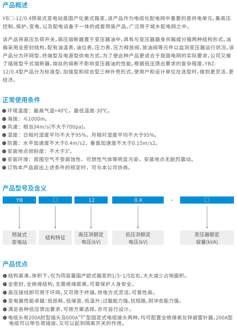 YB-12/0.4预装式变电站是国产化美式箱变。该产品作为电缆化配电网中重要的是供电单元,集高压控制、保护、变电、以及配电设备于一体的成套预装产品,广泛用于城乡配电网之中。